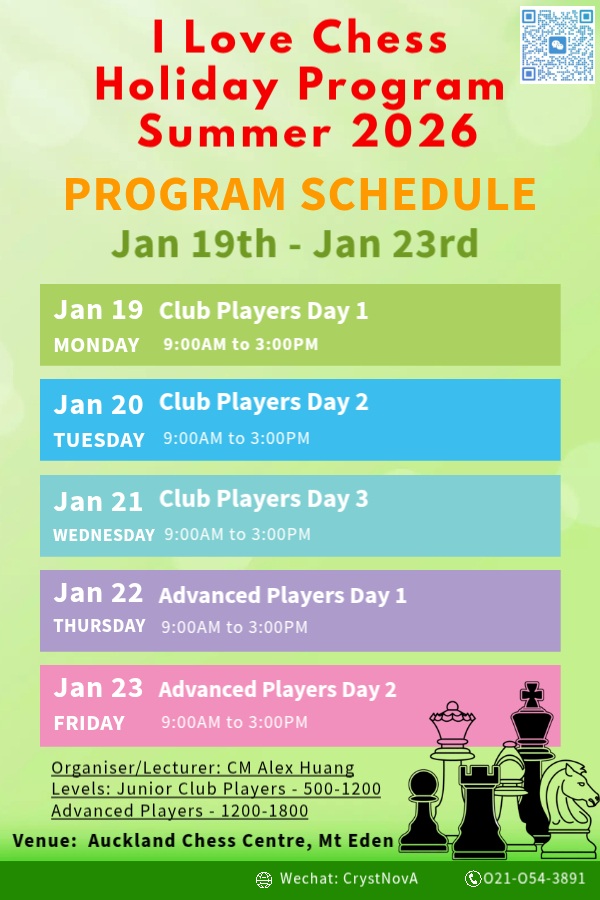 Hi everyone, The I Love Chess Holiday Program Summer 2026 starts on Monday 19th January to Friday 23rd January. The poster and details are as follows: